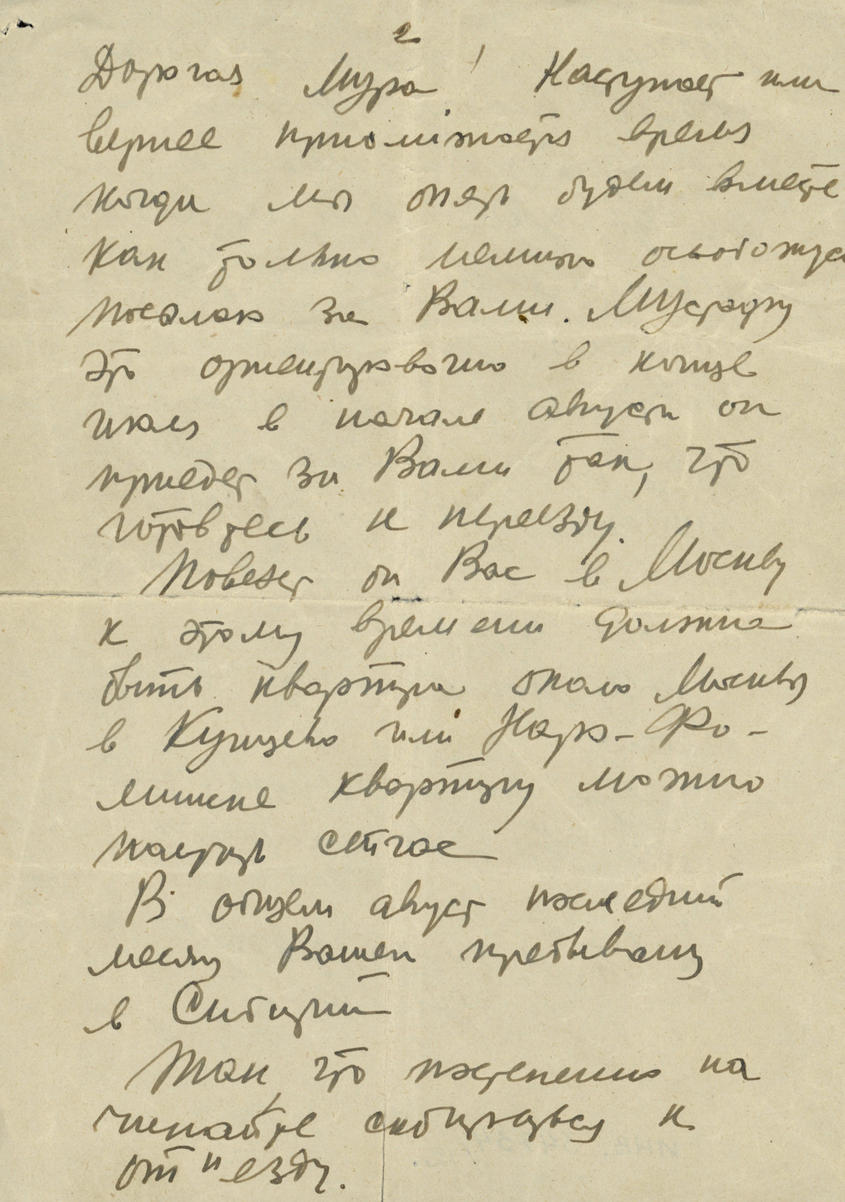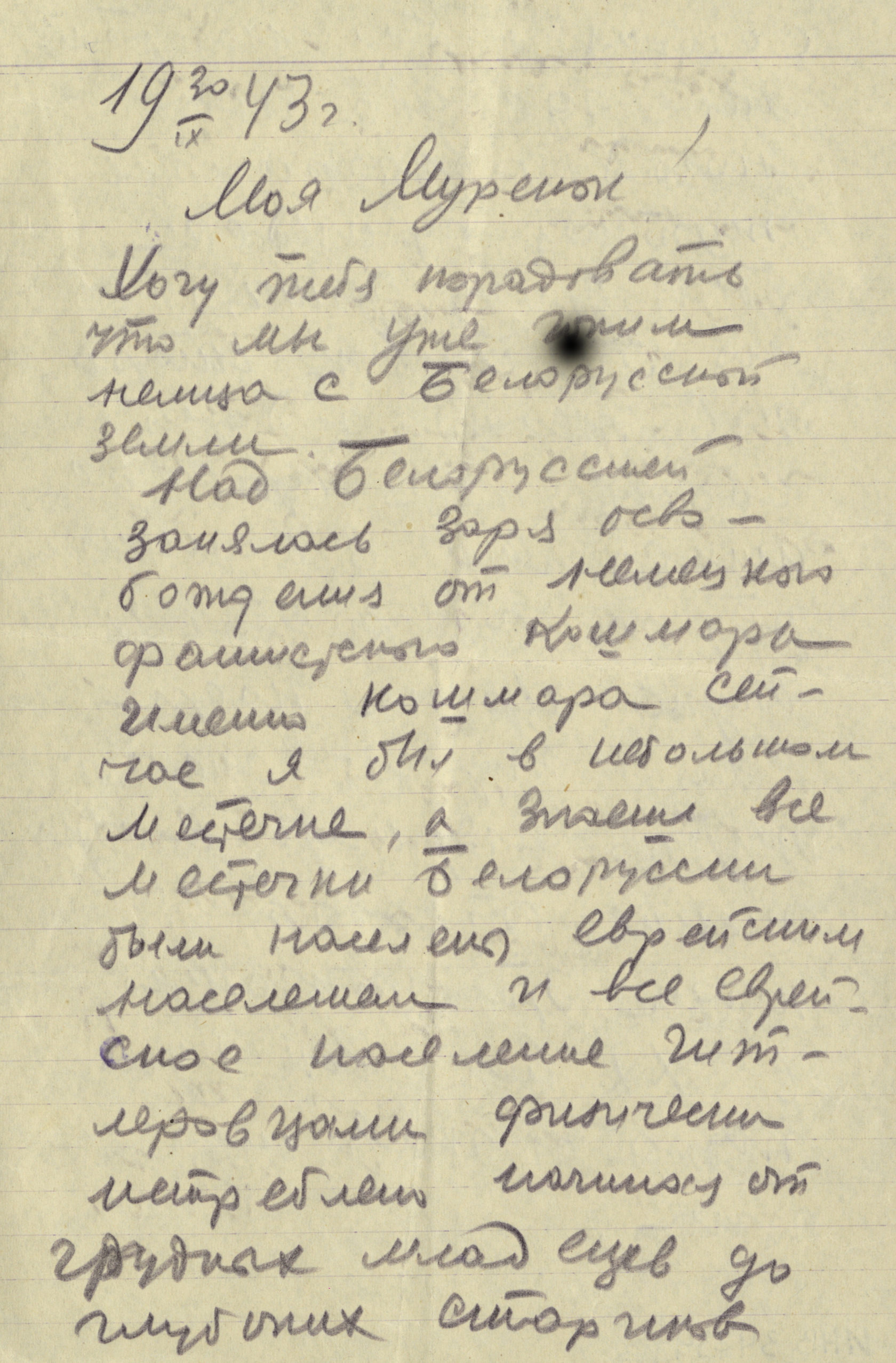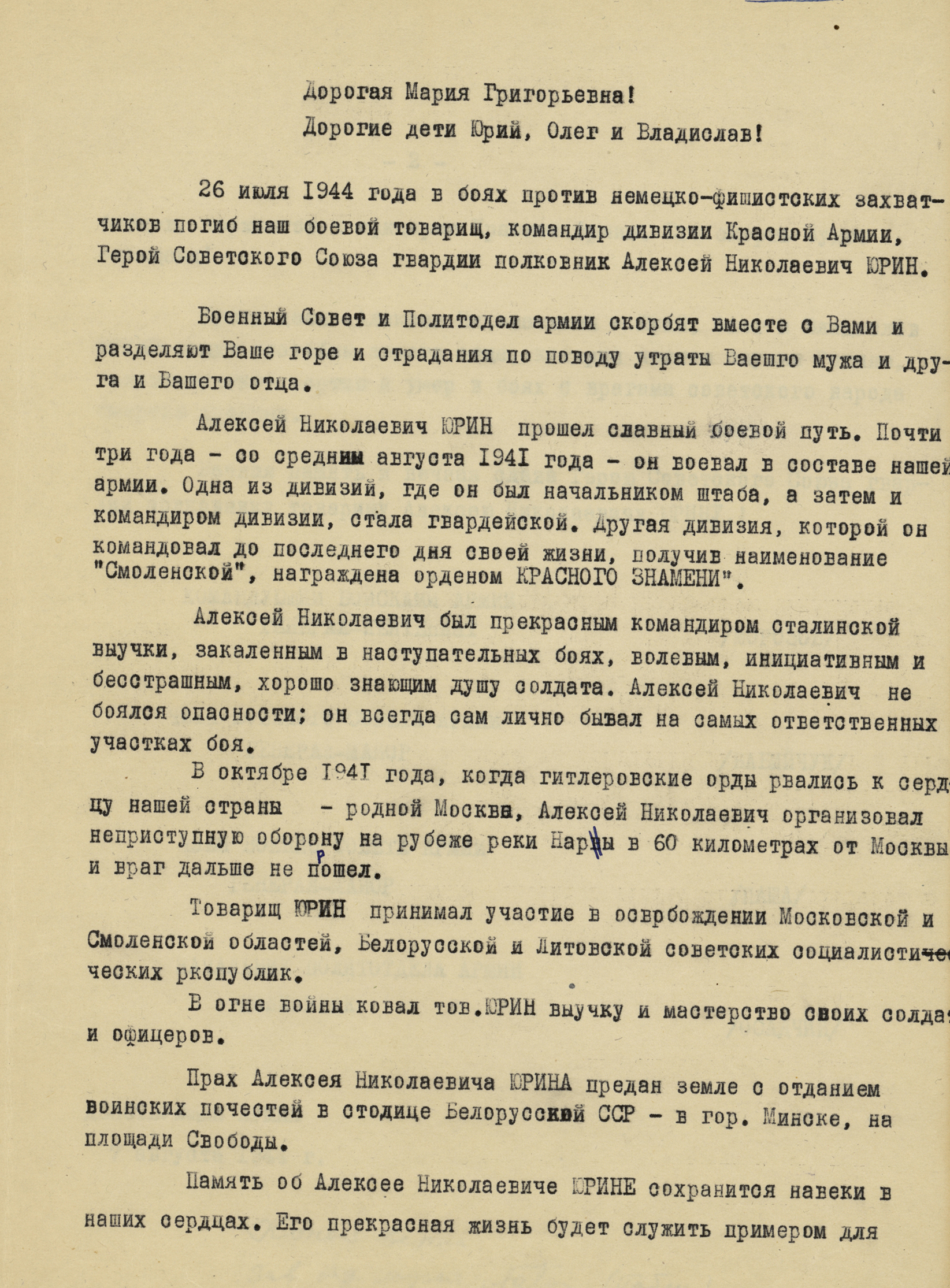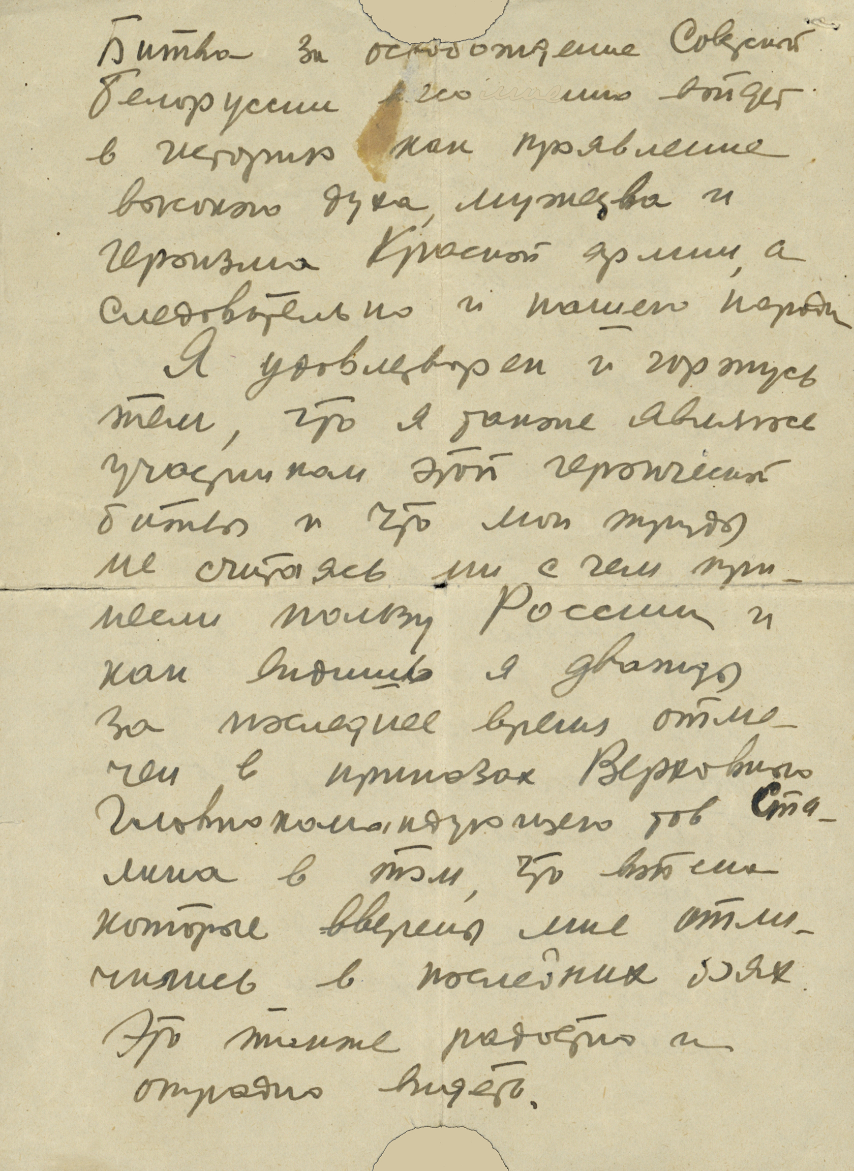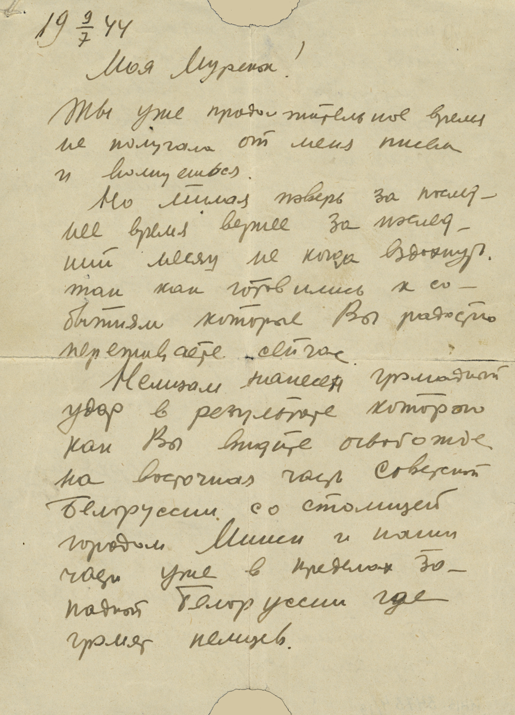 Моя Муренок!… Милая, поверь, за последнее время, вернее за последний месяц, некогда вздохнуть, так как готовились к событиям, которые вы радостно переживаете сейчас. Немцам нанесён громадный удар, в результате которого освобождена восточная часть Советской Белоруссии со столицей городом Минском и наши части уже в пределах Зап. Белоруссии, где громят немцев. Битва за освобождение Советской Белоруссии несомненно войдёт в историю как проявление высокого духа, мужества и героизма Красной Армии и, следовательно, нашего народа. Я удовлетворён и горжусь тем, что также являюсь участником этой героической битвы и что мои труды… принесут пользу России… И, как видишь, я дважды за последнее время отмечен в приказах ВГК тов. Сталина в том,что войска, которые вверены мне, отличились в последних боях… Дорогая Мура! Наступает или, вернее, приближается время, когда мы опять будем вместе… ориентировочно в конце июля – в начале августа приеду за вами, так что готовьтесь к переезду в Москву. Так что постепенно начинайте собираться к отъезду". .
