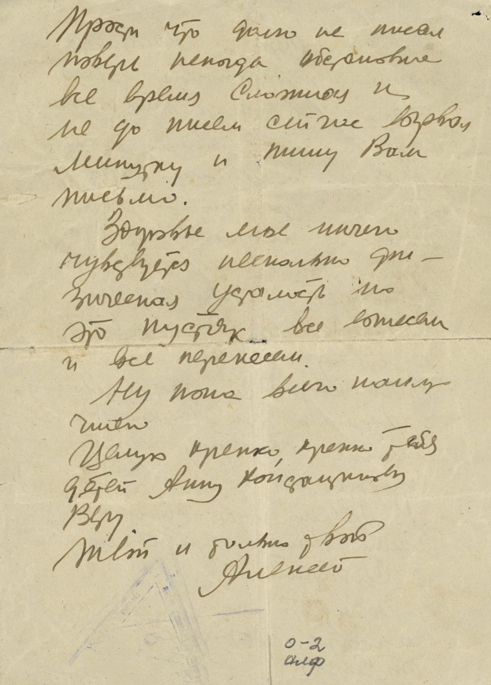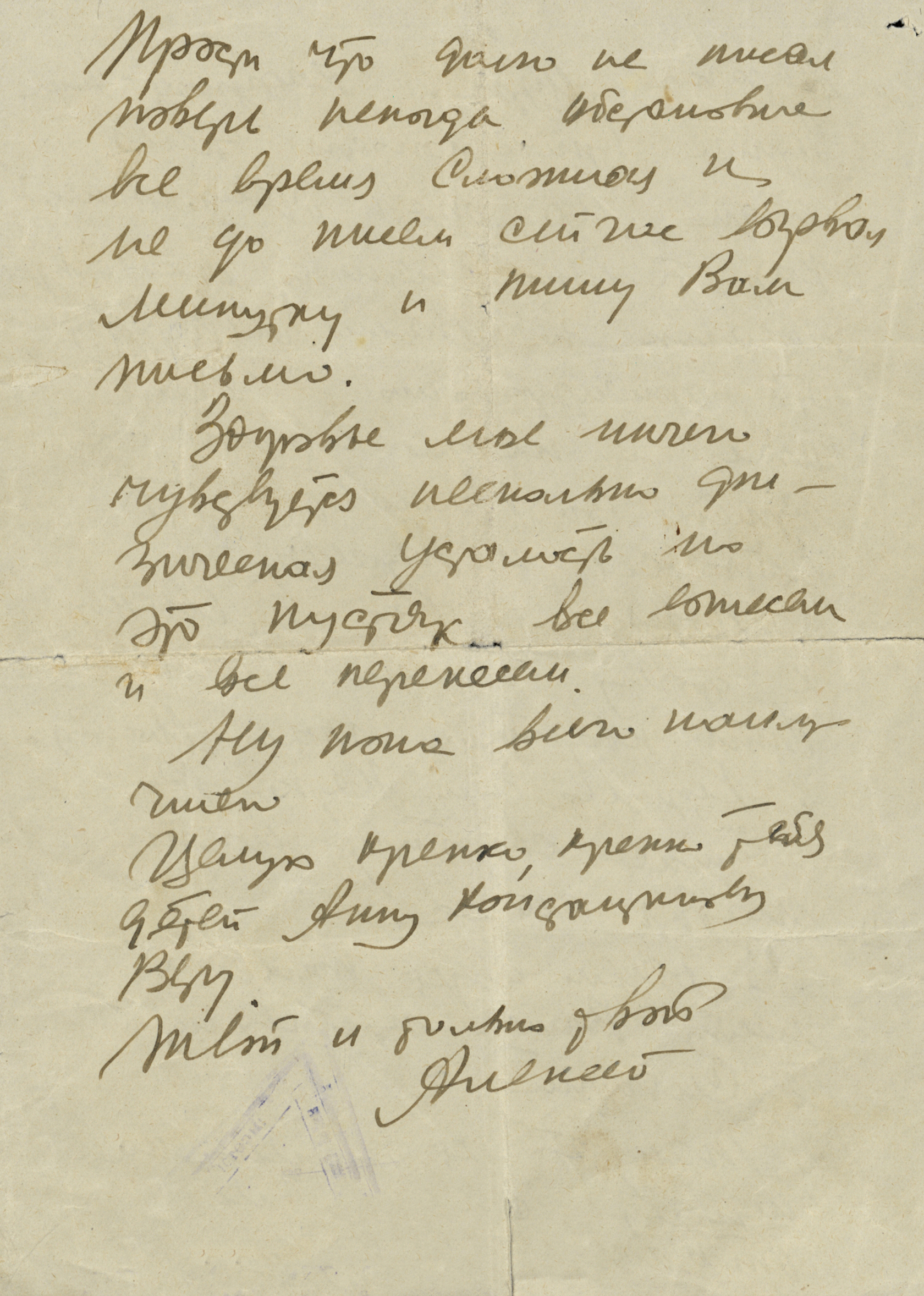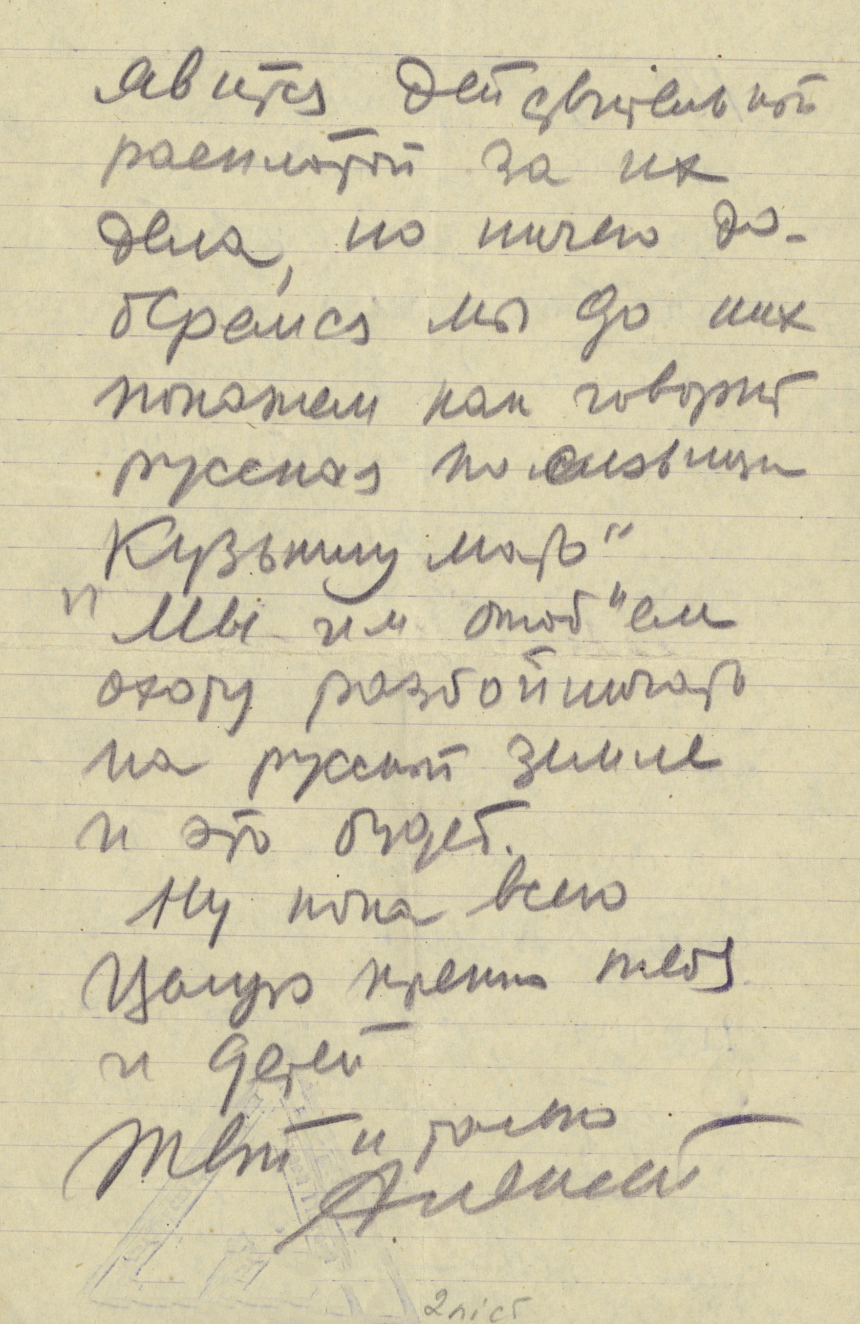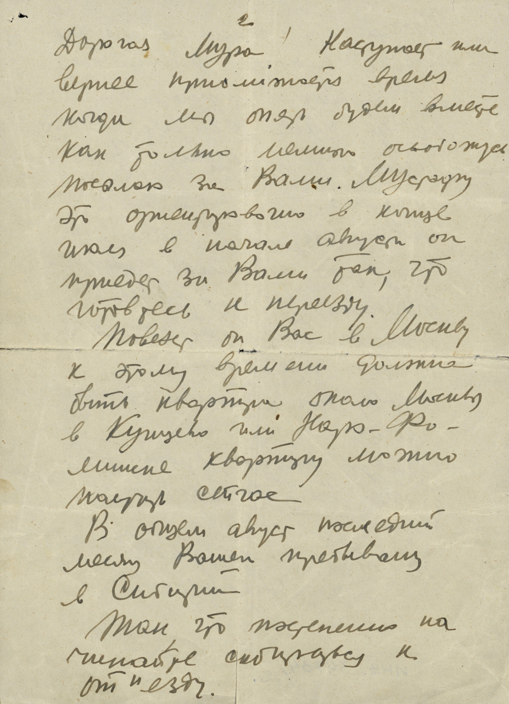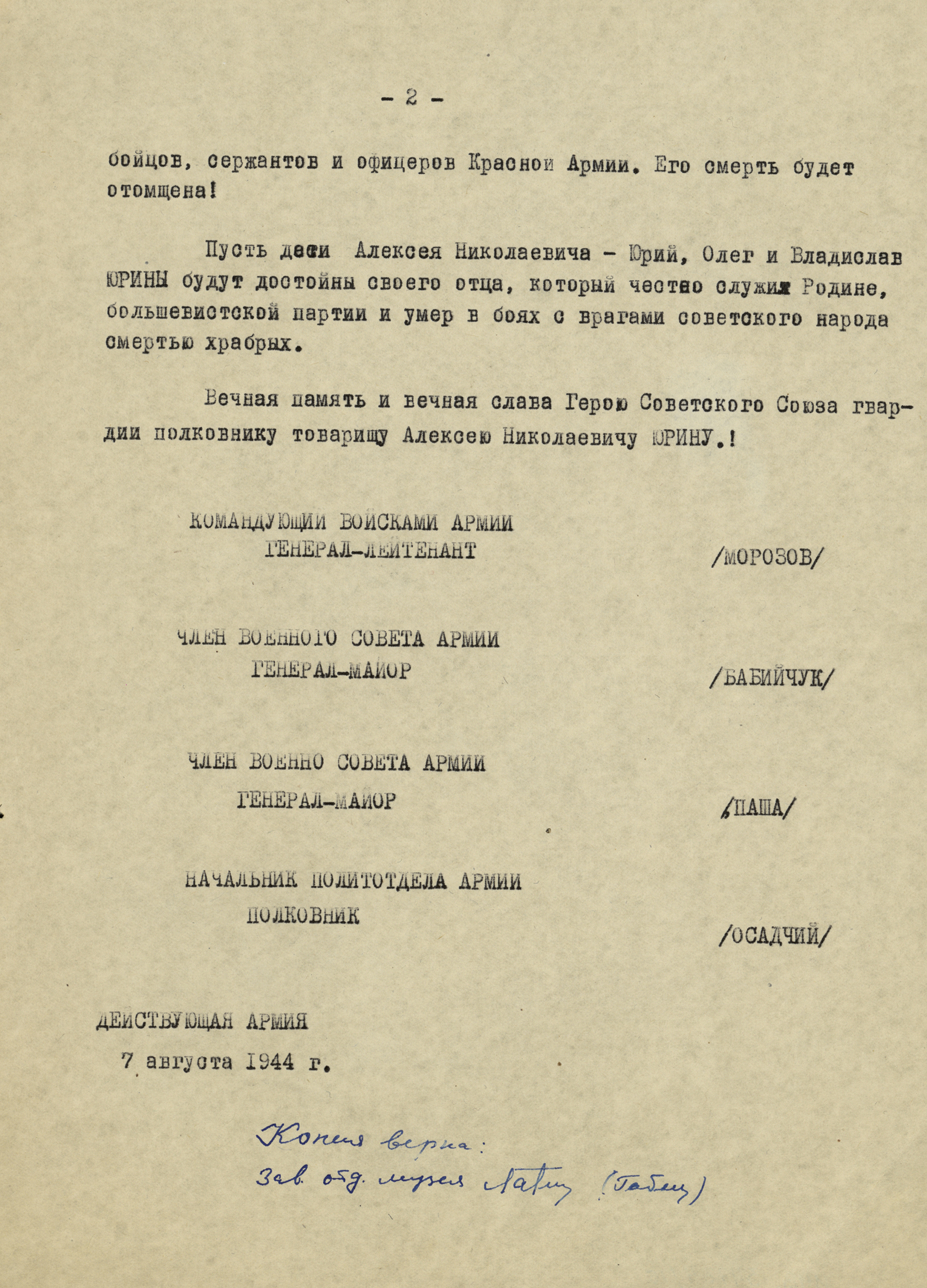 Моя Муренок!… Милая, поверь, за последнее время, вернее за последний месяц, некогда вздохнуть, так как готовились к событиям, которые вы радостно переживаете сейчас. Немцам нанесён громадный удар, в результате которого освобождена восточная часть Советской Белоруссии со столицей городом Минском и наши части уже в пределах Зап. Белоруссии, где громят немцев. Битва за освобождение Советской Белоруссии несомненно войдёт в историю как проявление высокого духа, мужества и героизма Красной Армии и, следовательно, нашего народа. Я удовлетворён и горжусь тем, что также являюсь участником этой героической битвы и что мои труды… принесут пользу России… И, как видишь, я дважды за последнее время отмечен в приказах ВГК тов. Сталина в том,что войска, которые вверены мне, отличились в последних боях… Дорогая Мура! Наступает или, вернее, приближается время, когда мы опять будем вместе… ориентировочно в конце июля – в начале августа приеду за вами, так что готовьтесь к переезду в Москву. Так что постепенно начинайте собираться к отъезду". .