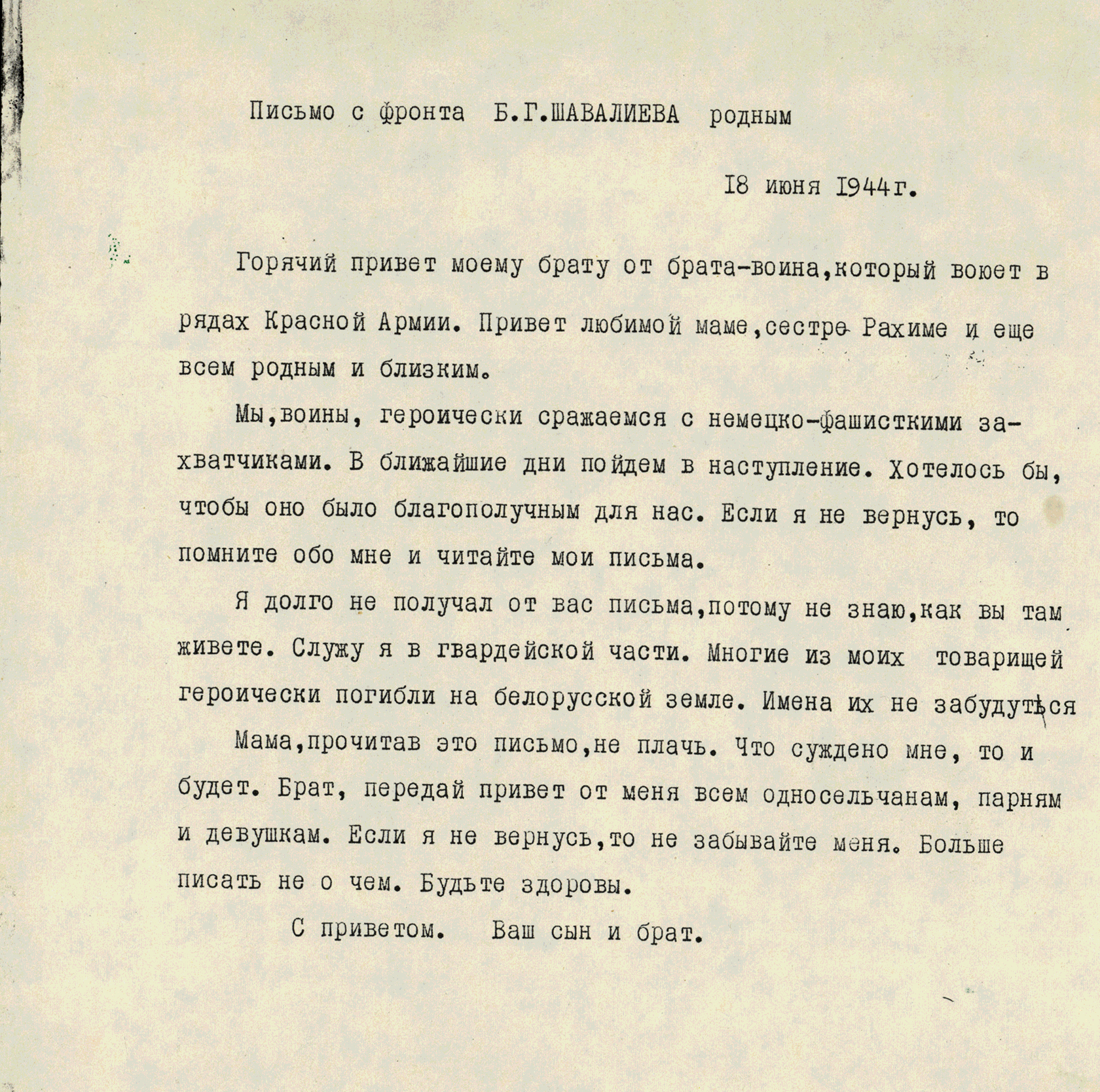 "…гвардейцы залегли под шквальным огнём вражеского пулемёта из дзота. Они томились этой задержкой, рвалось сердце вперёд, но огонь вставал непроходимой стеной. Гвардейцы видели, как в нескольких десятках метров от дзота вдруг встал во весь рост гвардии младший лейтенант Иван Ильченко. Видели воины, как вскочил вслед за ним его ординарец гвардии сержант Барий Шавалиев… Офицер и ординарец, обнявшись, пошли на дзот. Пулемётная очередь раздробила ноги Шавалиеву, из последних сил он упал на пулемёт. Офицер, сам уже раненый, шагнул вперёд и упал на амбразуру дзота, закрыл её своей грудью. Так совершили два гвардейца, наши Матросовы, высший подвиг. Страшна была ярость гвардейцев, рванувшихся в атаку через умолкший дзот. Село на горе было взято. Немцев перебили всех до последнего".