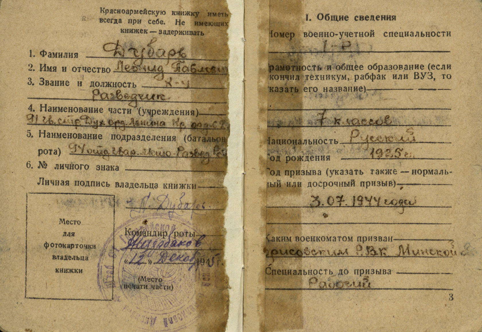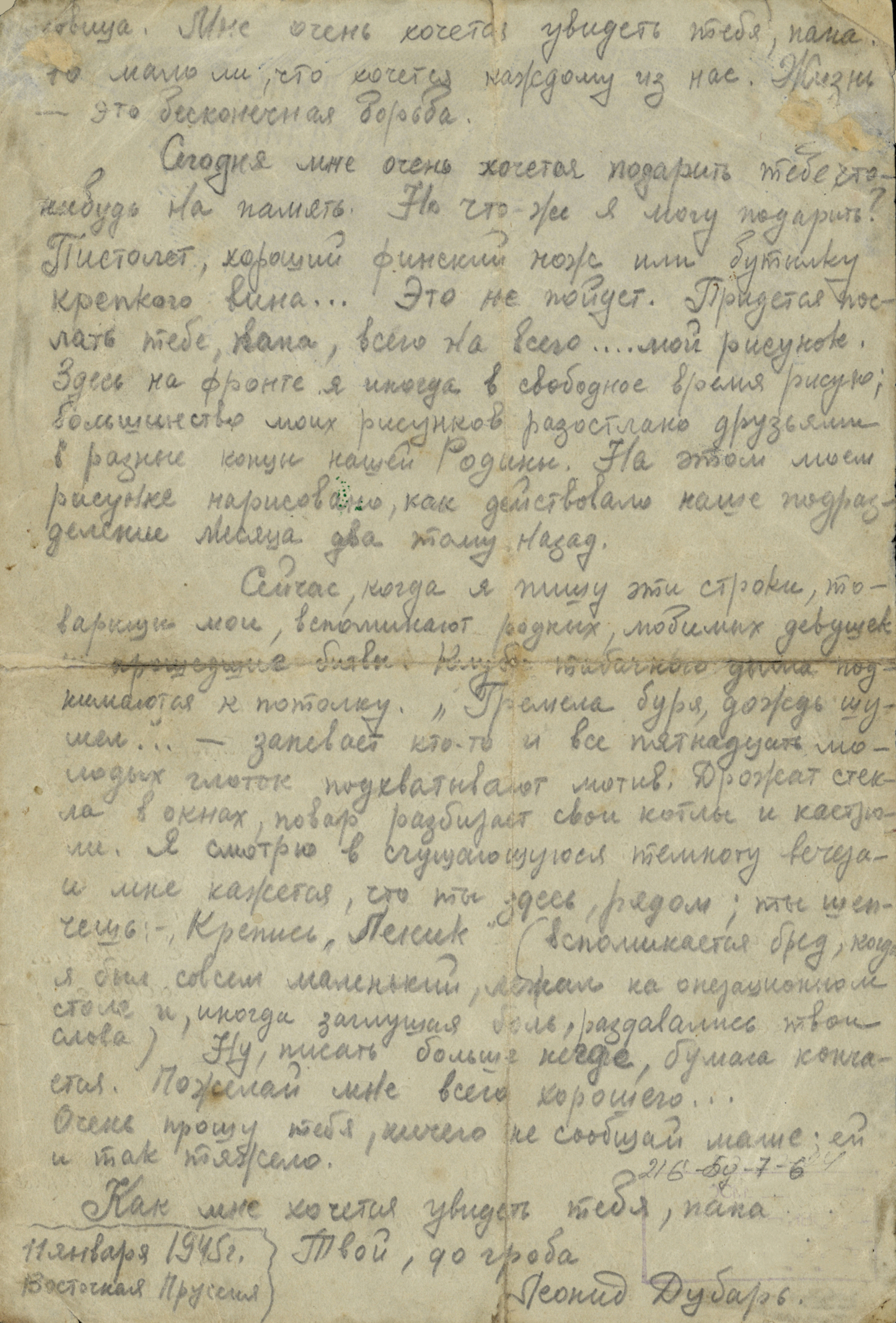 По-разному складываются судьбы художников. Уделом некоторых бывает прижизненный успех, чего нельзя сказать про Леонида Павловича Дубаря (1925–1978). Только в 1979 году на выставке, посвящённой памяти художника, впервые увидели свет его многочисленные работы. А скольким эскизам и зарисовкам не суждено было стать живописными полотнами, в том числе и фронтовому рисунку "Поиск" на небольшом листке миллиметровки. Именно в этом простом рисунке уже тогда раскрывался талант вчерашнего могилёвского подростка.