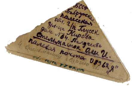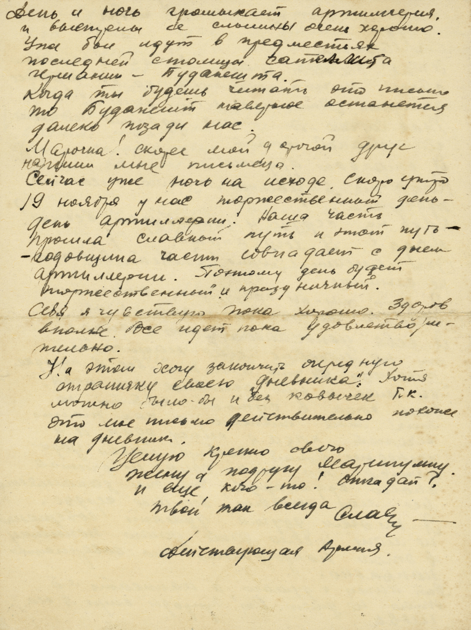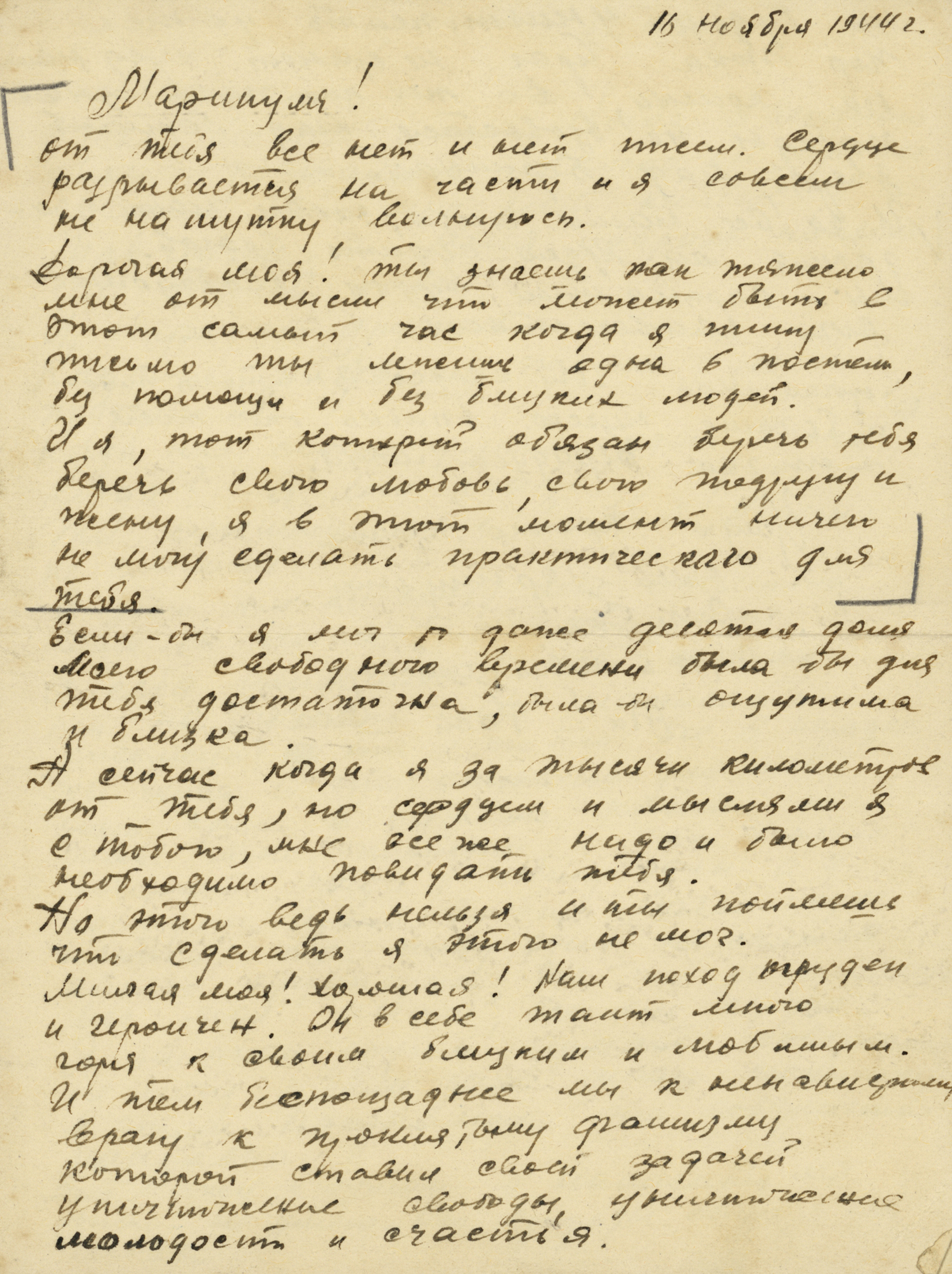 "Маринуля! От тебя всё нет и нет писем. А сейчас, когда я за тысячи километров от тебя, но сердцем и мыслями с тобой, мне всё же и надо и было необходимо повидать тебя. Но этого ведь нельзя… Милая моя! Хорошая! Наш поход труден и героичен. Он в себе таит много горя к своим близким и любимым. И тем беспощаднее мы к ненавистному врагу к проклятому фашизму, который ставил своей задачей уничтожение свободы, уничтожение молодости и счастья. Целую крепко. Крепко. Желаю здоровья и сил своему наследнику или наследнице, ещё точно не знаю".