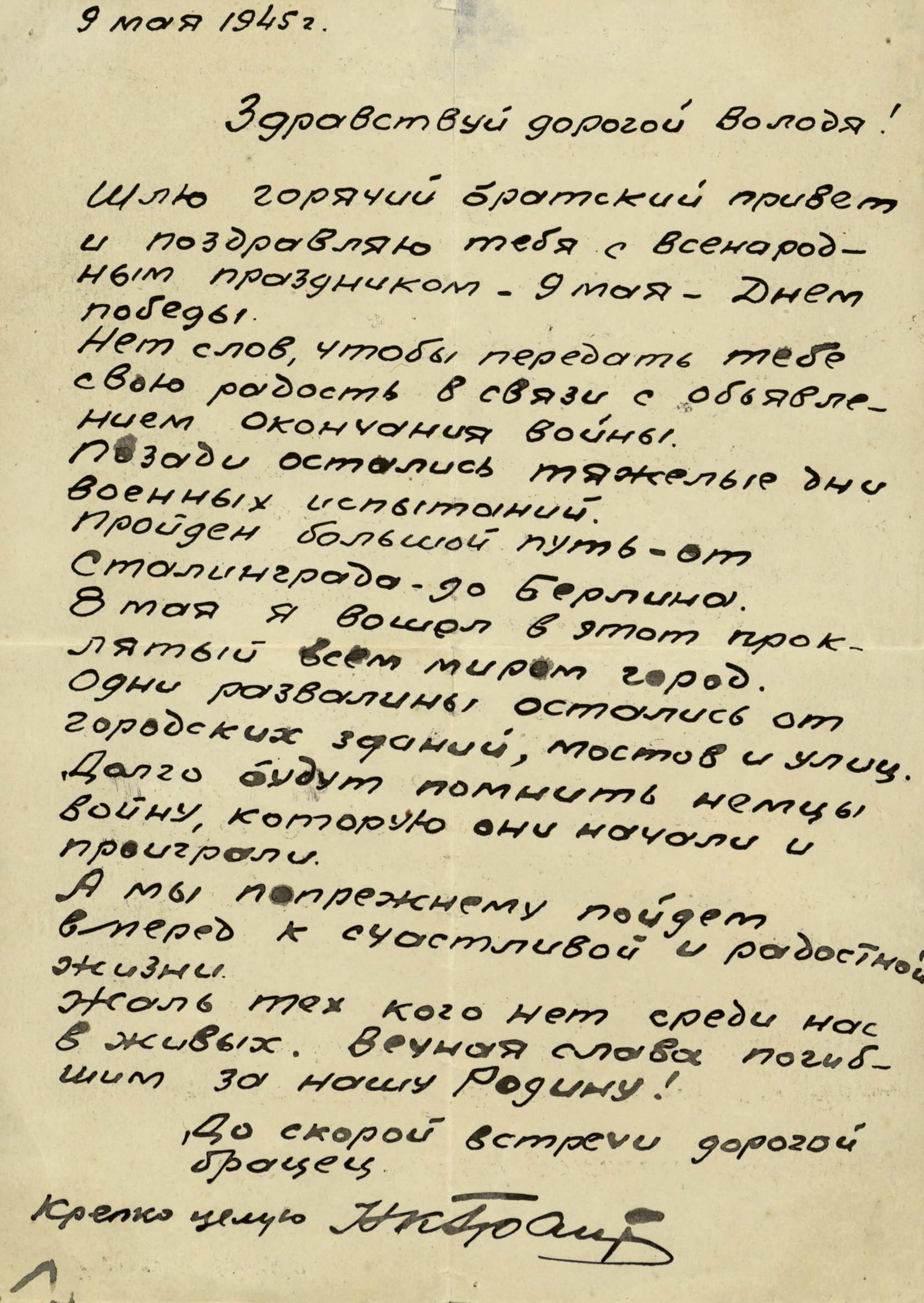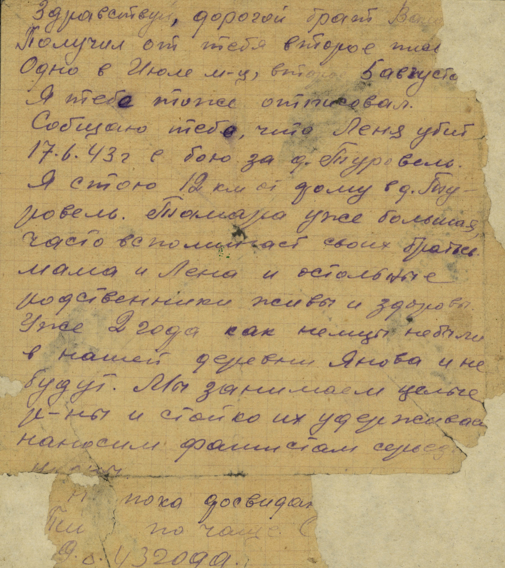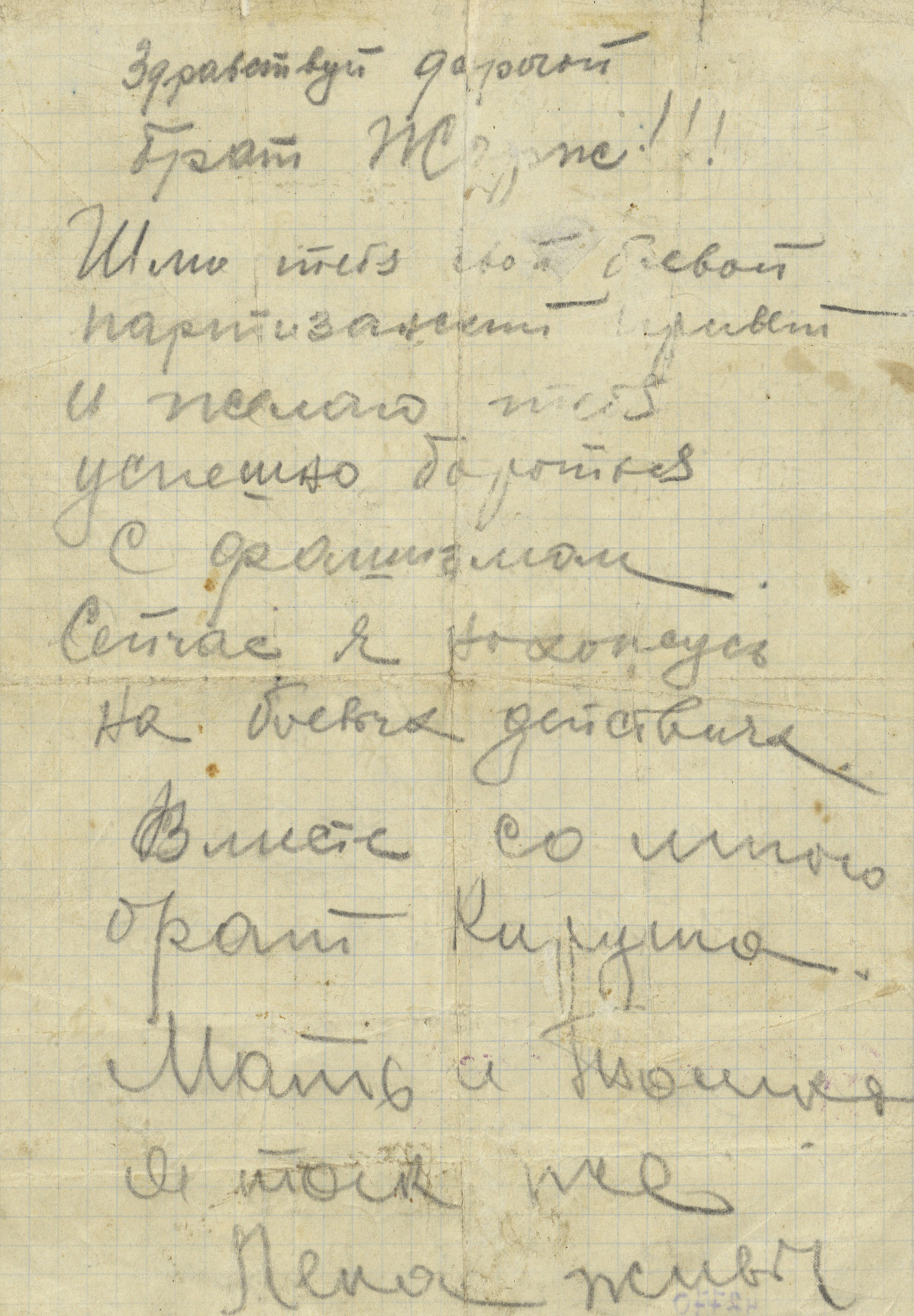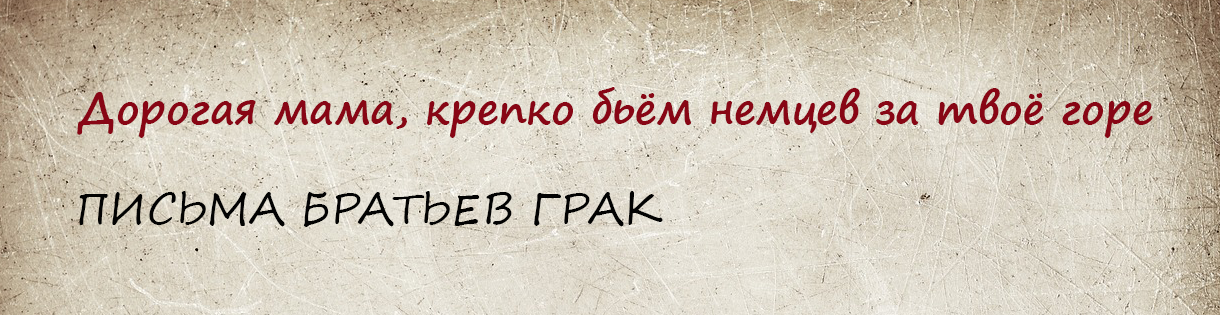 "Здравствуй, дорогая мама и сестрица Тамара! Шлю вам свой горячий боевой привет и крепко целую вас в этот радостный день вашего освобождения. Решил написать весточку, что жив и здоров. Ни на минуту не забываю вашу судьбу, а известно о вас многое. Мне хотелось попасть на участок фронта по направлению к вам, но не пришлось – наступаю южнее. Был в Минске и ушёл дальше. Крепко бьём немцев, мстим им за твоё горе, слёзы и кровь. Мстим за брата Лёню, за всё, что натворили немцы. Я уже давно на фронте. Получил правительственную награду. Все братья, Кирилл, Володя, Коля, живы и здоровы. Пишу это письмо со слезами на глазах и не знаю, живы ли вы? Знаю, что немцы спалили нашу хату. После войны построим дачу братьев партизан Граков и Беловых. Тебя, мама, очень уважает тов. Белов, называет патриоткой Родины. На этом кончаю, тороплюсь дальше. Беспрерывно мы бьём немцев, гоним их всё дальше и дальше. Скоро встретимся, не горюй, мама. Жить будем хорошо. До свидания. Крепко обнимаю и целую тебя и Тамару. Жду от вас весточку… Сын Жорж".